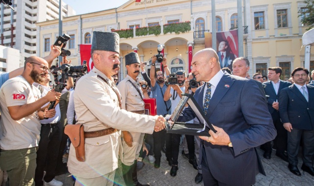 İzmir’in işgalden kurtuluşunun 100. yıldönümü kutlamaları kapsamında Konak Meydanı’nda temsili bayrak töreni yapıldı. Törende İzmir’in kurtuluşunu canlandıran süvari birlikleri İzmir Hükümet Konağı’nın önüne geldi ve Yüzbaşı Şerafettin’i temsil eden bir asker Hükümet Konağı’na Türk bayrağını çekti.