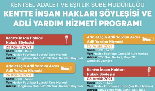 6 Aralık-7 Aralık tarihlerinde 11.00’de Meslek Fabrikası Karabağlar Kurs Merkezi’nde “Kentte İnsan Hakları” söyleşisi var. 10.00-16.00 saatleri arasında ise adli yardım hizmeti olacak.