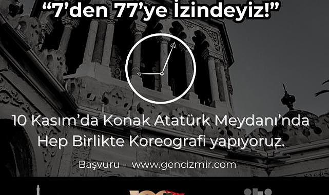 Katılmak isteyen İzmirliler gencizmir.com adresinden başvurabilir. İzmir Büyükşehir Belediyesi, ulu önder Mustafa Kemal Atatürk’ün ölümünün 85. yıldönümünde Konak Atatürk Meydanı’nda 10 Kasım saat 09.05’te “7’den 77’ye İzindeyiz!” yazıyor. Saat Kulesi etrafına ise ''09:05'' saat görseli koreografisi yapılacak. Herhangi bir yaş sınırının olmadığı etkinliğe katılmak isteyen İzmirliler gencizmir.com adresinden başvurabilir.