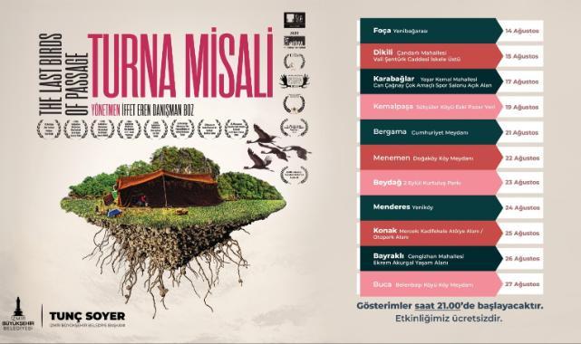 İzmir Büyükşehir Belediyesi’nin “Yeniden Sinematek” gösterimleri, 11 ayrı ilçede Ağustos ayında da izleyiciyle buluşmaya devam ediyor. Ücretsiz olarak izlenebilen “Turna Misali” filminin başlama saati 21.00. Göç hikayesini anlatan film 14 Ağustos’ta Foça’da, 15 Ağustos’ta Dikili’de, 17 Ağustos’ta Karabağlar Yaşar Kemal Mahallesi’nde, 19 Ağustos’ta Kemalpaşa Sütçüler’de izleyicilerle buluştu.