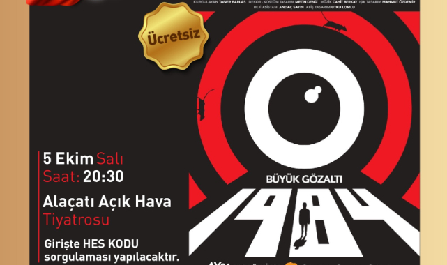 Alaçatı Tiyatro Günleri kapsamında 5 Ekim Salı günü Rutkay Aziz’in yönettiği, Taner Barlas’ın kurguladığı 1984 (Büyük Gözaltı) George Orwell’in kült romanı 1984’teki distopyayı tiyatro sahnesine taşıyor.