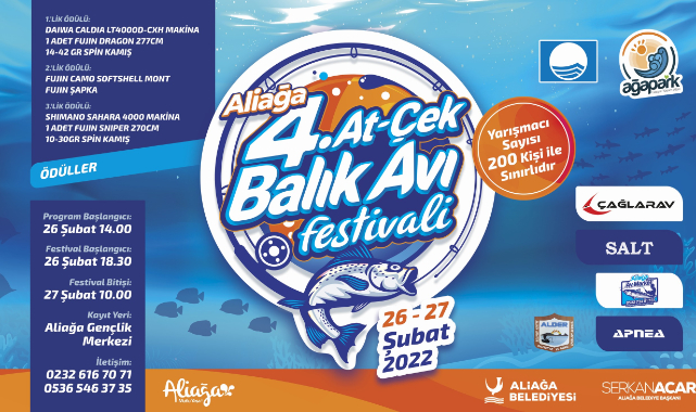Aliağa Belediyesi’nin bu yıl 26-27 Şubat 2022 tarihlerinde 4’üncüsünü düzenleyeceği At-Çek Balık Avı festivaline kısa bir süre kala heyecan giderek artıyor. Aliağa’nın Mavi Bayraklı Plajı Ağapark’ta organize edilecek festivale Türkiye'nin dört bir tarafından balık avı tutkunları yoğun ilgi gösterirken sınırlı tutulan kontenjanlar da kısa sürede doldu.