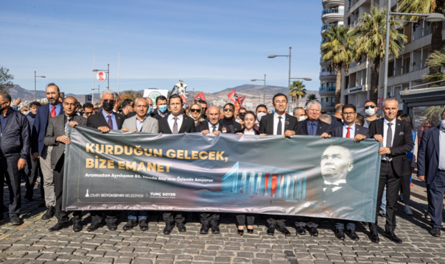 İzmir Büyükşehir Belediye Başkanı Tunç Soyer, yürüyüşün ardından Cumhuriyet Halk Partisi (CHP) İzmir İl Örgütü tarafından Cumhuriyet Meydanı’nda düzenlenen 10 Kasım anma programına katıldı. Çelenk sunumunun sonrasında katılımcılara seslenen Başkan Tunç Soyer, “Ata’mızın bize bıraktığı mirasa sahip çıkmanın en önemli yolu, Cumhuriyetimizi demokrasi, özgürlükler ve adaletle taçlandırmaktır. Biliyorum ki bu ülkenin tüm insanlarının hayal ettiği Türkiye’yi hep birlikte inşa edeceğiz. Bu değişimi, Ata’mızın mirasından hareketle köy ve şehirlerimizdeki tüm vatandaşlarımızla, kadınlarla ve gençlerle gerçekleştireceğiz. Ulu Önder Mustafa Kemal Atatürk’ün değerini çok daha iyi anladığımız şu günlerde, Ata’mızın bıraktığı uygarlık mirası yolumuza ışık tutuyor. Onu, her yıl daha da artan bir özlemle, rahmet ve şükranla anıyorum” dedi.