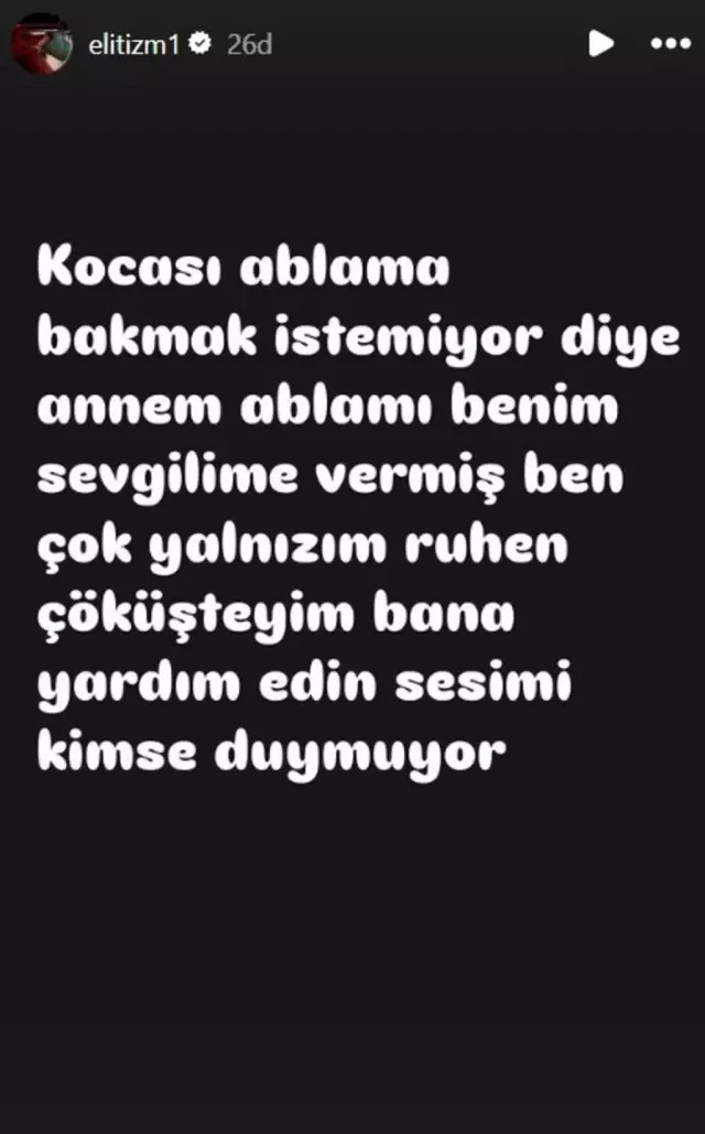 Bahar Candan bununla da kalmayıp "Kocası ablama bakmak istemiyor diye annem ablamı benim sevgilime vermiş. Ben çok yalnızım ruhen çöküşteyim. Bana yardım edin sesimi kimse duymuyor" dedi.