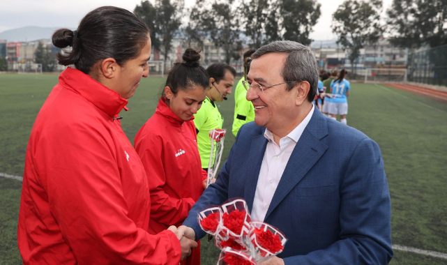 Konak Belediye Başkanı Abdül Batur, Konak Belediyespor - Trabzonspor maçı öncesi, kadın futbolcuların 8 Mart Dünya Kadınlar Günü’nü kutladı.