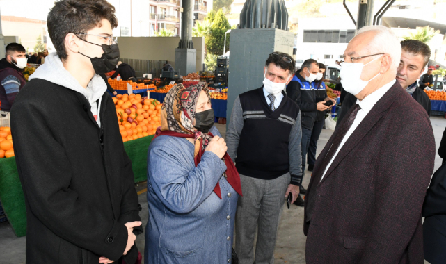 Karabağlar Belediyesi'nin kente kazandırdığı Kibar Belediye Hizmet Kompleksi'ne giden Başkan Selvitopu, üst katta bulunan modern pazaryerini ziyaret etti. Pazarcı esnafına hayırlı işler dileyerek onların yeni yılını kutladı.