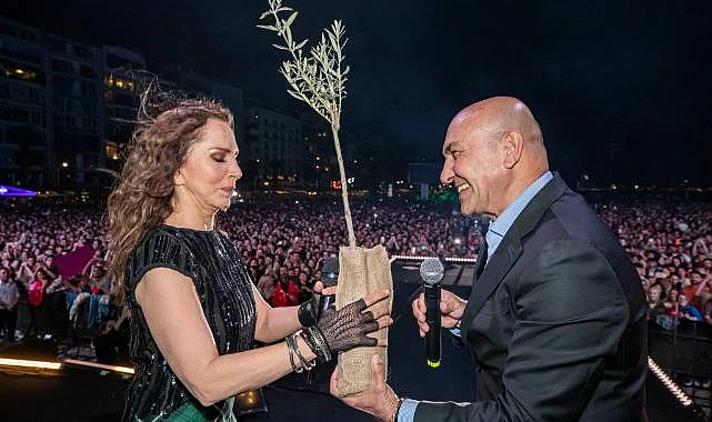 Sertab Erener üçüncü şarkısından sonra İzmir Büyükşehir Belediye Başkanı Tunç Soyer’i sahneye davet etti. Başkan Tunç Soyer, Erener’e günün anısına zeytin fidanı armağan etti. İzmirlilere seslenen Başkan Tunç Soyer, “Aslında hep beraber çok güzel bir hikayeyiz. Her birimiz tek tek o hikayenin satırları, cümleleri, sözcükleriyiz. Birimiz eksik olduğunda o hikaye anlamını, değerini, güzelliğini kaybeder. Onun için eksik olmamamız lazım. Yarından sonra çok önemli bir seçime gidiyoruz. Bu seçim, sadece bir cumhurbaşkanlığı seçimi değil. Bu seçim uzun yıllar sonuç doğuracak bir seçim. Onun için eksiksiz sandıklara gitmek ve sonuna kadar sahip çıkmak zorundayız. Çünkü o seçimin sonucunu biz belirleyebiliriz. Biz çok güçlüyüz. Yeter ki umudumuzu kaybetmeyelim, yeter ki boş vermeyelim oy verelim. Yeter ki oyumuzla oyunu bozalım. Göreceksiniz kazanacağız. Gelecek ortak hikayemizi sandıkta oylarımızla yazacağız" dedi.