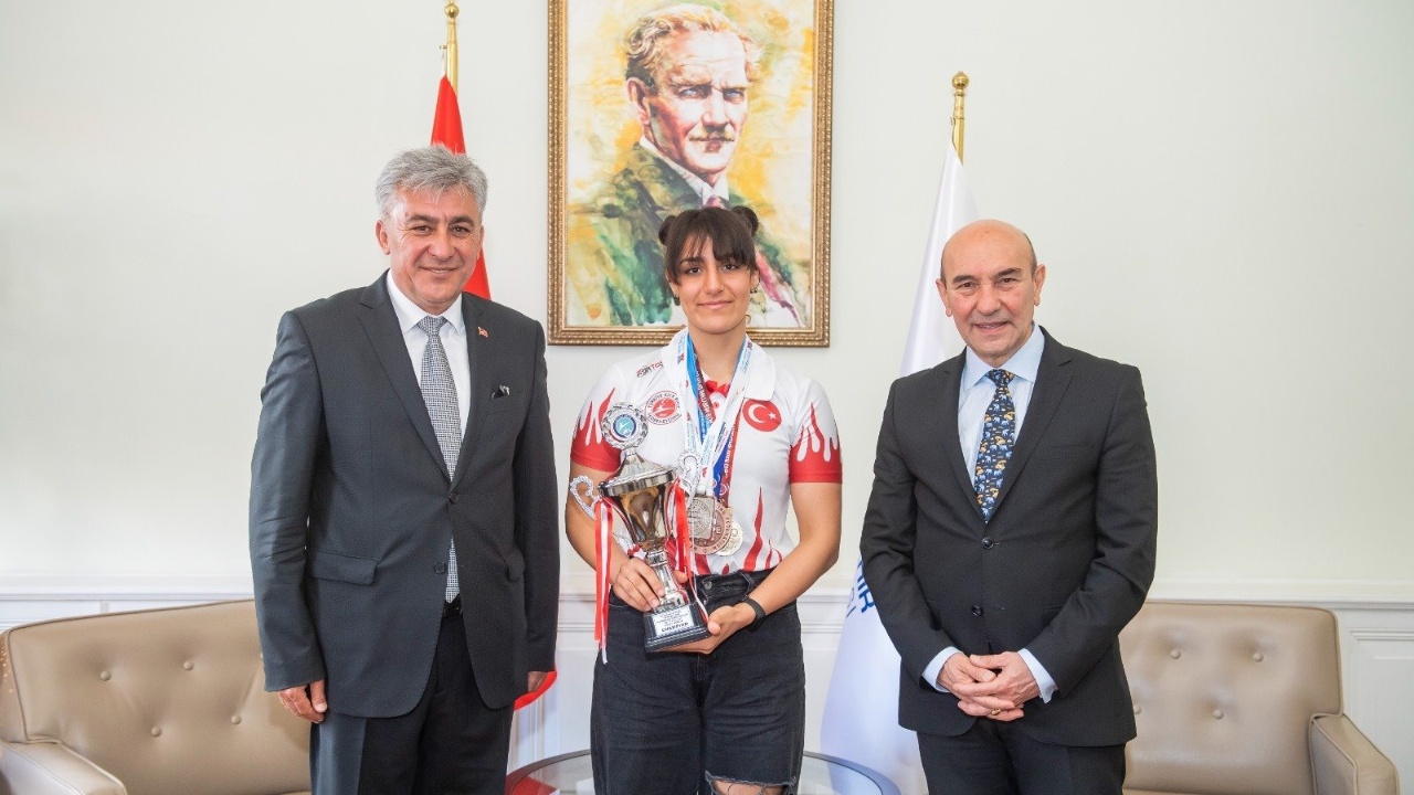 İzmir Büyükşehir Belediye Başkanı Tunç Soyer dövüş sporlarındaki 4 branşta başarıya imza atan sporcu Bilge Su Gürel’i ağırladı. Başkan Tunç Soyer, “Çok gurur duyduk. Gücümüz neye yeterse yanınızdayız” dedi