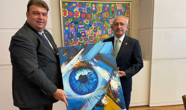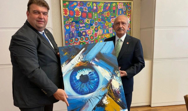 Seferihisar Belediye Başkanı İsmail Yetişkin, CHP Genel Merkezi'nde Genel Başkan Kemal Kılıçdaroğlu'nu ziyaret etti. Çalışmaları ve gerçekleştirilmesi gündemde olan projeler hakkında bilgi veren Yetişkin, Kılıçdaroğlu'na Seferihisar Belediyesi'nin Uluslararası Resim Çalıştayı'nda sergilenen "Mavi Gözün Işığında" tablosunu hediye etti.