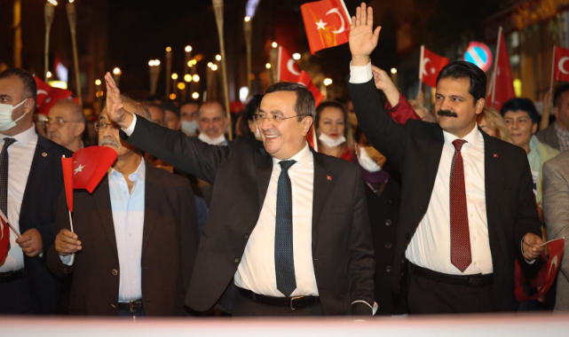 ve çok sayıda vatandaş katıldı. İzmir Marşı eşliğinde yapılan yürüyüşte, Cumhuriyet ateşini simgeleyen meşaleler sokakları aydınlattı.