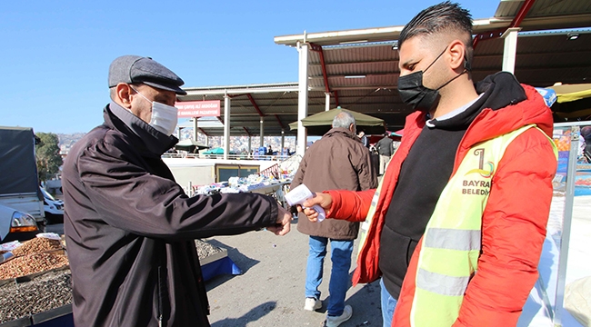 Bayraklı Belediye Başkanı Serdar Sandal, "Salgının ilk gününden bu yana Bayraklı'da insan yoğunluğunun olduğu her alanda tüm tedbirleri alıyoruz ve çalışmalarımızı aralıksız sürdürüyoruz. Ekiplerimiz, pazar yerlerinde toplum sağlığı için kontroller yaparak, yurttaşlarımızı dikkatli olmaya ve kurallara uymaya davet ediyor. Kendi tedbirlerimizi alıp, ihtiyaç durumuna göre mümkün olduğunca evde kalmaya da özen göstermemiz gerekiyor. Bu günleri hep birlikte dayanışmayla atlatacağız" dedi.