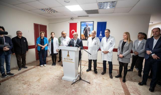 Başhekim Op. Dr. Kadir Devrim Demirel, Başhekim Yardımcıları Yavuz Uçar, Arif Kutsi Güder, Filiz Dağ ve hastane personelinin bulunduğu ziyarette konuşan Başkan Tunç Soyer, “Size bütün kalbimle çok teşekkür ediyorum. Sizin varlığınız bizlere o kadar büyük güç, o kadar büyük umut ki… Sizinle gerçekten gurur duyuyorum. Biz sadece yemek yardımı gıda yardımı yapmıyoruz. Sahra hastanesi de kurduk. Bu bambaşka bir şey. Büyük gurur. Çok zor şartlarda mesleğinizi yaptığınız için size minnettarım” diye konuştu.