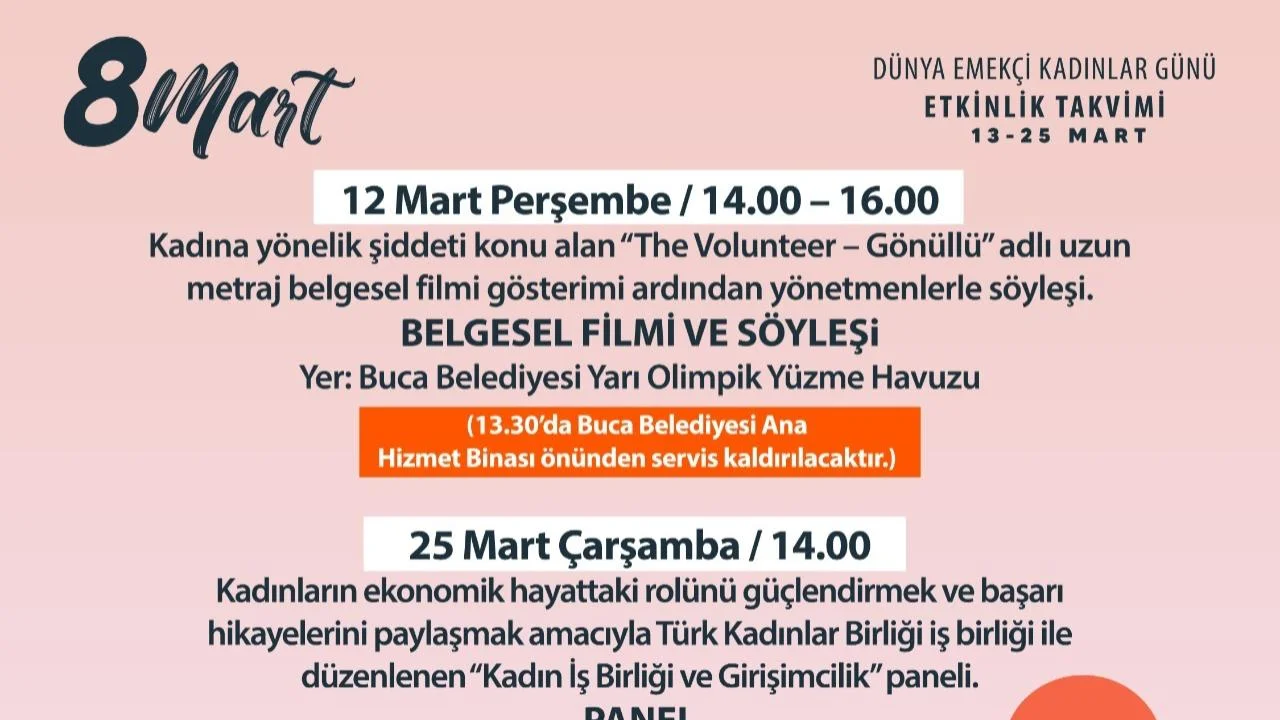 Buca Belediyesi, 8 Mart Dünya Emekçi Kadınlar Günü’nü ay boyunca sürecek etkinliklerle kutlayacak. Belediye programında, kadın mücadelesi ve başarısını öne çıkaran çeşitli organizasyonlar yer alıyor.