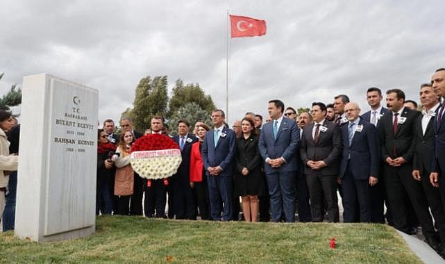 CHP'nin 8. Genel Başkanı Özgür Özel, Ecevit'in mezarına partisinin çelengini bıraktıktan sonra dua etti. Ardından basın mensuplarına açıklamada bulunan Özel, "Bugün; 1970'lerde yapılan 2'si yerel, 2'si genel seçimden partimizi birinci parti olarak çıkarma başarısını gösteren, çok partili dönemde şüphesiz CHP'nin en büyük başarılarına imza atan, üstlendiği başbakanlık görevi sırasında Kıbrıs'taki mezalime son veren, Kıbrıs'a yapılan askeri hareketa 'Barış Harekatı' adı veren, 'Biz sadece Türklere değil, Rumlara da barış getirmeye gidiyoruz' diyen ve o karardan sonra Kıbrıs'taki Türk vatandaşlarının, Türklerin katledilmesini durduran, bağımsız bir Kuzey Kıbrıs Türk Cumhuriyeti kurulmasının yolunu açan, bütün bu yaşananlara rağmen Rum halkıyla ve Yunanistan ile ilişkiler noktasında son derece diplomatik bir çerçeveyi yeniden sağlayabilmiş muhteşem bir devlet adamının huzurundayız. Biz burada 81 il başkanımızla birlikte Genel Başkanımızın ve Başbakanımızın huzurundayız. Ona layık olmaya, partimize layık olmaya çalışacağız. Onun genel başkanlığı devraldığı; Lozan kahramanı, Garp cephesi kumandanı İsmet Paşa'yı, İsmet Paşa'nın ölümünden sonra yerine geldiği Gazi Mustafa Kemal Atatürk'ü hem Kurtuluş Savaşı'na hem de Türkiye Cumhuriyeti'ne katkı yapan tüm devlet adamlarını, tüm genel başkanlarımızı minnetle anıyoruz. Bugün burada Sayın Genel Başkanımızın huzurunda saygıyla bulunuyoruz. Ona layık olmaya çalışacağız" dedi.