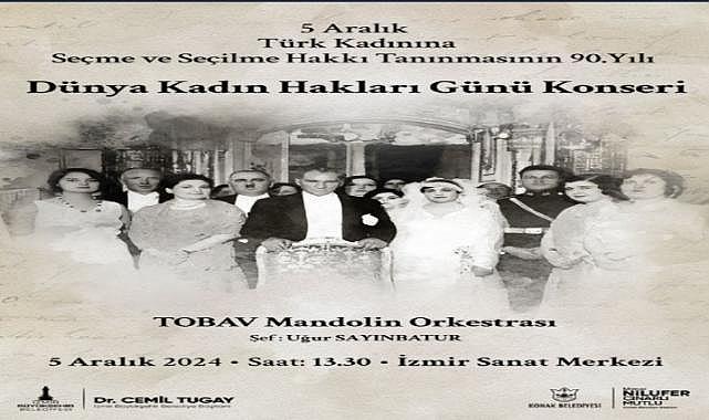 5 Aralık 1934’te Anayasa ve Seçim Kanunu’nda yapılan yasa değişikliği ile Türk kadınına seçme ve seçilme hakkı tanınmasının 90’ıncı yıl dönümü İzmir Büyükşehir Belediyesi ve Konak Belediyesi iş birliği ile düzenlenen konser programı ile kutlanacak. TOBAV Mandolin Orkestrası konseri, 5 Aralık günü saat 13.30’da Kültürpark İzmir Sanat’ta ücretsiz olarak sahnelenecek. Orkestranın şefliğini Uğur Sayınbatur üstlenecek