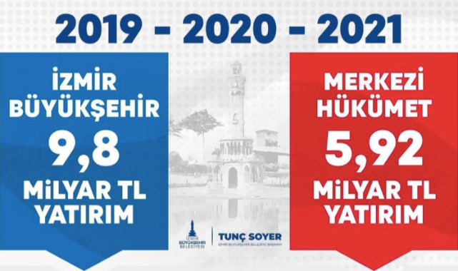Son olarak ifade etmemiz gereken bir başka ayrıntı ise İzmir Büyükşehir Belediyesi’nin 2019, 2020 ve 2021 yıllarının kapsayan süreçte İZSU ve ESHOT ile birlikte kente toplam 9.8 milyar lira tutarında yatırım yaptığı, aynı dönemde merkezi idarenin İzmir’deki yatırımlarının toplamının 5.92 milyar lirada kaldığı gerçeğidir."