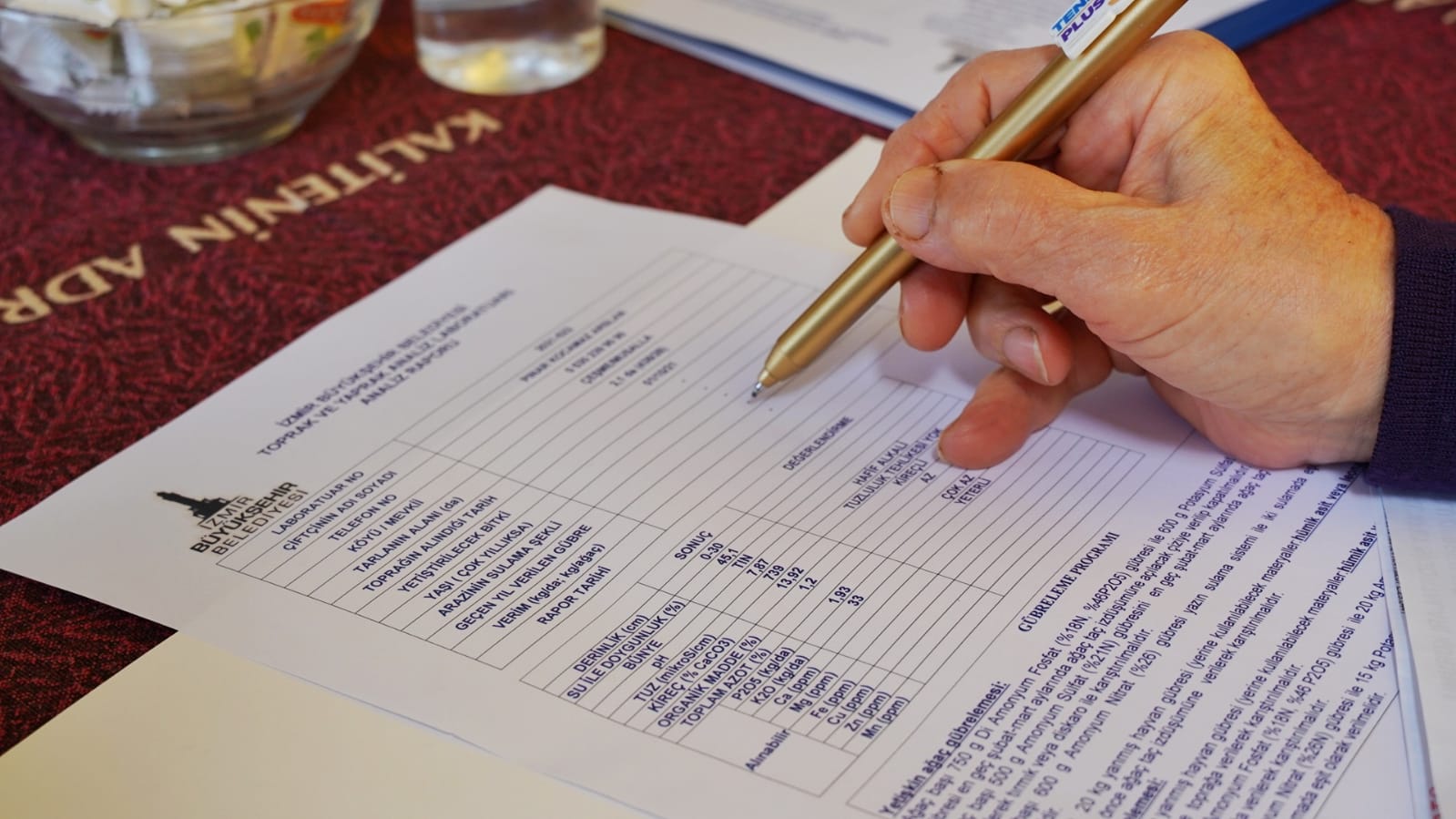 Mühendisi Ayşe Duman üreticilere toprak analiz raporlarını dağıttı. Çeşme topraklarının 7 PH ve üzerinde olduğunu söyleyen Duman, Çeşme topraklarında üre gübre kullanımını