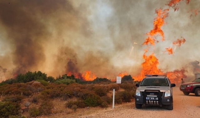 İzmir’in Çeşme ilçesinde makilik alanda çıkan yangına havadan ve karadan müdahale sürerken, yangının çıkış sebebi de belli oldu. Çiftlikte kaynak yapan işçilerin sıçrattığı kıvılcım nedeniyle çıktığı öğrenilen yangında ihmali olan kişiler hakkında adli işlem başlatıldı. Çeşme Kutlu Aktaş Barajı yakınlarında bulunan makilik alanda saat 13.30 sıralarında çıkan yangın, rüzgarın da etkisiyle büyüyerek geniş bir alana yayıldı. Yangına İzmir Orman Bölge Müdürlüğü ekipleri; 3 uçak, 6 helikopterle havadan, 30 arazöz ve 4 dozer ile karadan müdahale ederken alevler, Rüzgar Enerji Santralleri’nin de (RES) etrafını sardı. Ayrıca İzmir-Çeşme otoyolunun Uzunkuyu mevkii, makilik alanda çıkan yangın nedeniyle trafiğe kapandı.