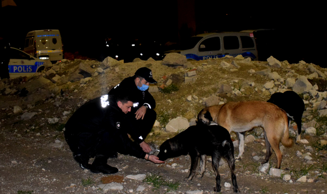 Çeşme İlçe Emniyet Müdürlüğü ekipleri, gece boyunca olumsuz hava koşulları nedeniyle yem bulamayan sokak hayvanları için mama dağıttı