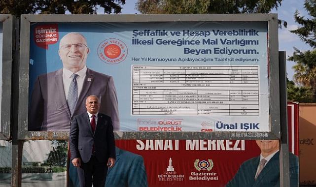 Yerel seçim öncesi açıkladıkları mal varlıkları ile gündeme gelen CHP’li belediye başkan adaylarına İzmir’den bir yenisi eklendi. Cumhuriyet Halk Partisi Gaziemir Belediye Başkan Adayı Ünal Işık güncel mal bildiriminde bulunurken varlıklarını ayni ve nakdi olarak kamuoyuyla paylaştı. CHP’li Işık, ilçenin görünür yerlerindeki afiş ve billboardlar aracılığıyla mal varlığını herkese duyurdu.