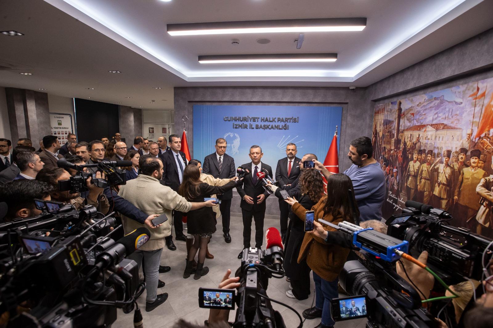 Toplantı öncesi basın mensuplarının sorularını yanıtlayan CHP Lideri Özel, “İzmir İl Başkanlığı’mızdayız. Bugün İzmir’deki tüm ilçe belediyelerimizin ve Büyükşehir Belediyemizin yapmış oldukları çalışmalarla ilgili kapsamlı bir değerlendirme raporunu ve bunun halkta yarattığı memnuniyeti, güçlü yanlarımızı, daha çok güçlendirilmesi gereken yanlarımızı konuşacağımız değerlendirme toplantımız var. Türkiye’de çok acılı bir gündemin içindeyiz. Ama hemen öncesinde de sonrasında da Sayın Erdoğan’ın talimatlarıyla, İstanbul Başsavcısı’nın eliyle Türkiye’de siyaset, yargı tacizi altındadır. Türkiye’de gündem yargı tacizi altındadır. Devam eden soruşturmalar ve bu soruşturmalara ilişkin olarak atılan tüm adımlar ile Türkiye’yi gerçek gündeminden uzaklaştırmaya ve korku iklimi oluşturmaya çalışıyorlar. Biz bu iklime teslim olmamak için elimizden geleni yapıyoruz. Maalesef Sayın Erdoğan ve saray rejimi dediğimiz düzen bundan fayda görüyor. Çünkü Türkiye’nin gerçek sorunlarını konuşmak yerine bir gerginlik, bir stres, bir kavga üzerinden gündemin ilerlemesini tercih ediyorlar” şeklinde konuştu.