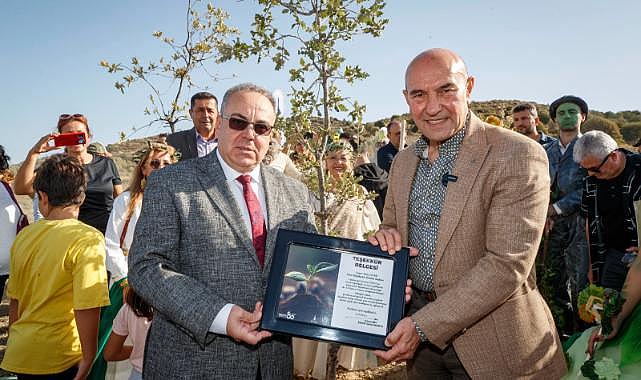 Törende ESHOT Hatıra Ormanı tabelası altında toplu fotoğraf çekimi gerçekleşti. ESHOT Genel Müdürü Bey ise fidan diken ve çocuklarla birlikte fidana can suyu veren Başkan Soyer’e teşekkür sertifikasını takdim etti.