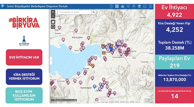 İzmir Büyükşehir Belediyesi’nin depremzedeler için başlattığı dayanışma kampanyası sürüyor. “Bir Kira Bir Yuva” kampanyası kapsamında kira desteği 38 milyon 89 bine ulaştı. Halkın Bakkalı ve Biz İzmir dijital platformu üzerinden satın alınan destek paketlerindeki toplam tutar ise 21 milyonu geçti.