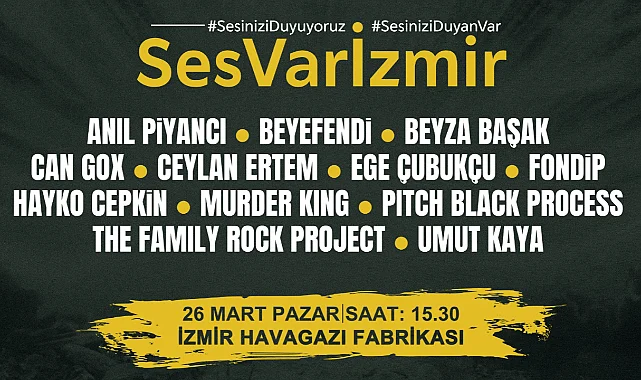 İzmir Büyükşehir Belediyesi, Türkiye'de 11 ili etkileyen depremlerin yaralarını sarmak amacıyla birçok sanatçıyı aynı anda İzmir’de “Ses Var İzmir” dayanışma konserinde buluşturacak. Tarihi Havagazı Fabrikası’nda 26 Mart Pazar günü saat 15.30’da yapılacak konser kapsamında Anıl Piyancı, Beyefendi, Beyza Başak, Can Gox, Ceylan Ertem, Ege Çubukçu, Fondip, Hayko Cepkin, Murder King, Pitch Black Process, The Family Rock Project ve Umut Kaya sahne alacak. Konserin geliri İzmir Büyükşehir Belediyesi’nin depremlerin ardından sığınacak eve ihtiyaç duyan aileler için başlattığı Bir Kira Bir Yuva kampanyasına aktarılacak.