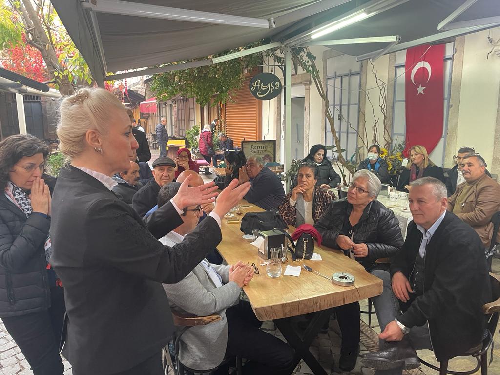 Çamdibi Bandosu’nun eşlik ettiği Derya Tüzen ve arkadaşları Kemeraltı’nda coşkuyla karşılandı. Tüzen, tüm esnafların ellerini tek tek sıkarak onların sorunlarını dinledi. Kortej Abacıoğlu Han’da son buldu. Abacoğlu Han’da yapılan toplantıda Konak Muhtarları mahallelerindeki sorunları ve istekleri Derya Tüzen ile paylaştılar.