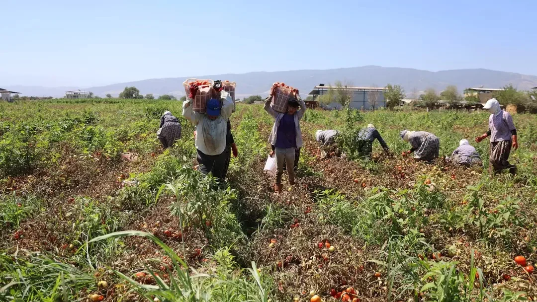Aydın’ın Köşk İlçesi’ndeki Çiftlik Mahallesi’nde domates hasadı devam ediyor. Sabah 06:00’da başlayan mesai, öğlen saatlerinde sona eriyor ve işçiler 45 dereceyi aşan sıcaklıkta çalışıyor.