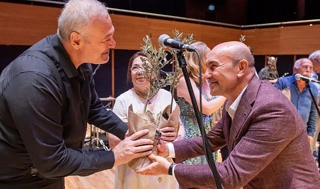 Gecenin sonunda Başkan Soyer sanatçılara zeytin fidanı verdi.