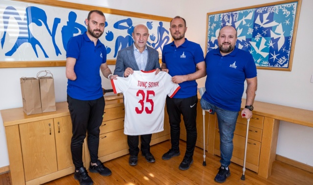Dünya Kupası’nı kazanan Ampute Futbol Milli Takımı’nın ve İzmir Büyükşehir Belediyesi Gençlik ve Spor Kulübü’nün kalecisi Erdi Arslan Başkan Tunç Soyer’i ziyaret ederek yaşadığı mutluluğu paylaştı. Arslan, Başkan Soyer’e Ay-Yıldızlı formayı hediye ederken Başkan Soyer ise, “Hiç görmediğiniz çocuklara umut oluyorsunuz” dedi.