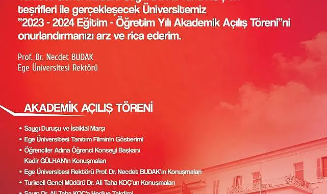 Ege Üniversitesi 2023-2024 Akademik Yılı Açılış Töreni, Turkcell Genel Müdürü Dr. Ali Taha Koç’un katılımıyla gerçekleşecek.