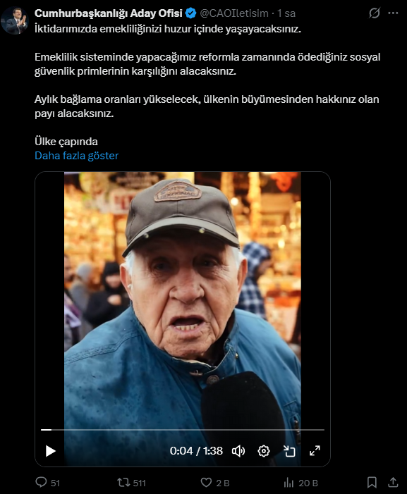 Paylaşım, özellikle artan yaşam maliyetleri karşısında zorlanan emekliler arasında geniş yankı uyandırırken, İmamoğlu’nun iktidar hedefi doğrultusunda sosyal politikaları ön plana çıkardığı mesaj olarak değerlendirildi.