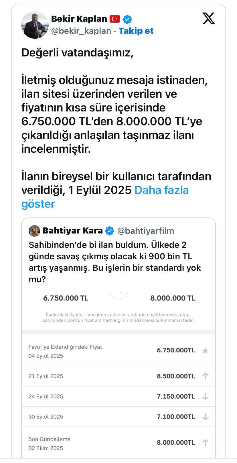 6 milyon 750 bin TL olarak girilen bir dairenin fiyatı, 2 Ekim 2025 itibarıyla 8 milyon TL’ye yükselmişti. Bakanlık, fiyat artışının genel ekonomik verilere uygun olmadığını belirleyerek ilgili kişiye 100 bin TL idari ceza uyguladı ve ilanı yayından kaldırdı.