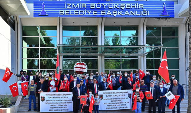 İzmir’deki gazi ve şehit yakınları, Sosyal Hizmetler Dairesi Başkanlığı bünyesinde Şehit Aileleri ve Gaziler Şube Müdürlüğü’nü kuran İzmir Büyükşehir Belediye Başkanı Tunç Soyer’e belediye önünde basın açıklaması yaparak teşekkür etti.