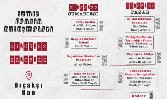 21 Mayıs Cumartesi günü saat 13.00’te Zarife Aslan’ın Grafiti Atölyesi sergi açılışıyla başlayacak etkinlikte Latife Tekin’in “Genç Edebiyatın İzinde”, Altay Öktem’in “Geçmişten Günümüze Fanzinler”, Enes Kurdaş moderatörlüğünde Cihat Duman ve Esat Cavit Başak’ın “Kaos ve Sanat” oturumları yapılacak. 22 Mayıs Pazar günü ise saat 13.00’te Ece Eldek ve İnanç Avadit’in “Dijital Dünyada Fanzinler”, Ahmet Keskinkılıç ve Yalım Aydın’ın “Türkiye’de Fanzin Yayıncılığı Forumu”, 15:30'da Asuman Susam ve Anita Sezgener’in atölye ve söyleşisi, 17:00'de Ozan C. Türkmen, Mihrap Aydın ve Fatih Çünkoğlu’nun “Genç Yazarlar Fanzin Deneyimleri” oturumları gençlerle buluşacak. Fanzin Buluşmaları, saat 18.30’daki konserle son bulacak.