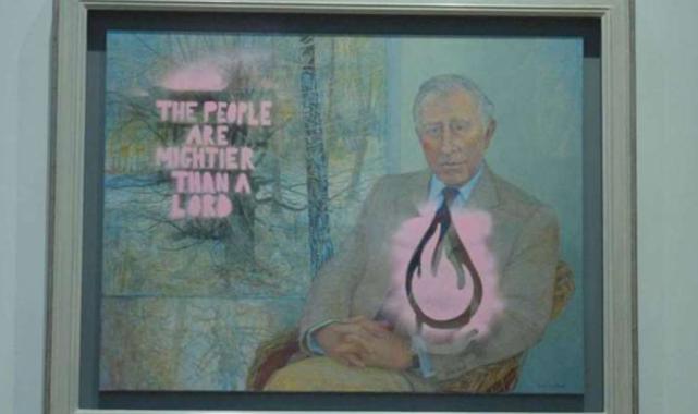 This is Rigged grubundan iklim aktivistleri, Edinburgh'daki Ulusal Portre Galerisi'nde bulunan İngiltere Kralı III.Charles tablosuna sprey boya ile "Halk, bir lorddan daha güçlüdür" yazdı.
