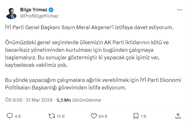 Paylaşımında, İyi Parti Genel Başkanı Meral Akşener'i de istifaya davet etti.