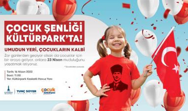 Kültürpark’taki Çocuk Şenliği 16 Nisan'da saat 11.00'de başlayacak. Kaskatlı Havuz yanında düzenlenecek programda 11.00 ile 14.00 arası çocuk, bilim ve kukla gösterilerinin olduğu çadır etkinlikleri yer alacak. Saat 13.00-16.00 arasında çocuk korolarının yer alacağı sahne etkinlikleri düzenlenecek. Açık alan etkinlikleri de saat 11.00-15.00 arasında yapılacak. Çocuklar kukla gösterileri, spor etkinlikleri, sokak oyunları, oyun parkuru, gezici kütüphane gibi birçok etkinlikle keyifli bir gün geçirecek.