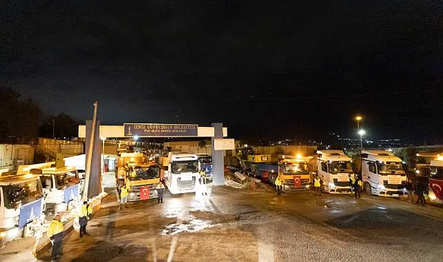 İzmir Büyükşehir Belediyesi’nin yolladığı araçlar arasında 12 tır lowbed, 2 greyder, 2 loder, 2 lastikli ekskavatör, 5 paletli ekskavatör, 3 hizmet aracı, 2 kar küreme aracı, 10 damperli kamyon, 2 damperli tır, 2 kasalı tır, 1 mobil veterinerlik aracı, 1 mobil tamir aracı, 5 cenaze aracı, 1 çoklu morg, 5 su tankeri ve 1 vidanjör yer alıyor.