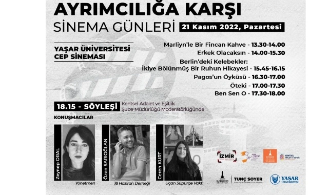 İzmir Büyükşehir Belediyesi kentte her türlü ayrımcılığa karşı mücadele etmek ve bir arada yaşam kültürünün toplumun her kesimine yayılmasını sağlamak amacıyla 21 ve 23 Kasım’da Yaşar Üniversitesi Cep Sineması’nda Ayrımcılığa Karşı Sinema Günleri düzenliyor.