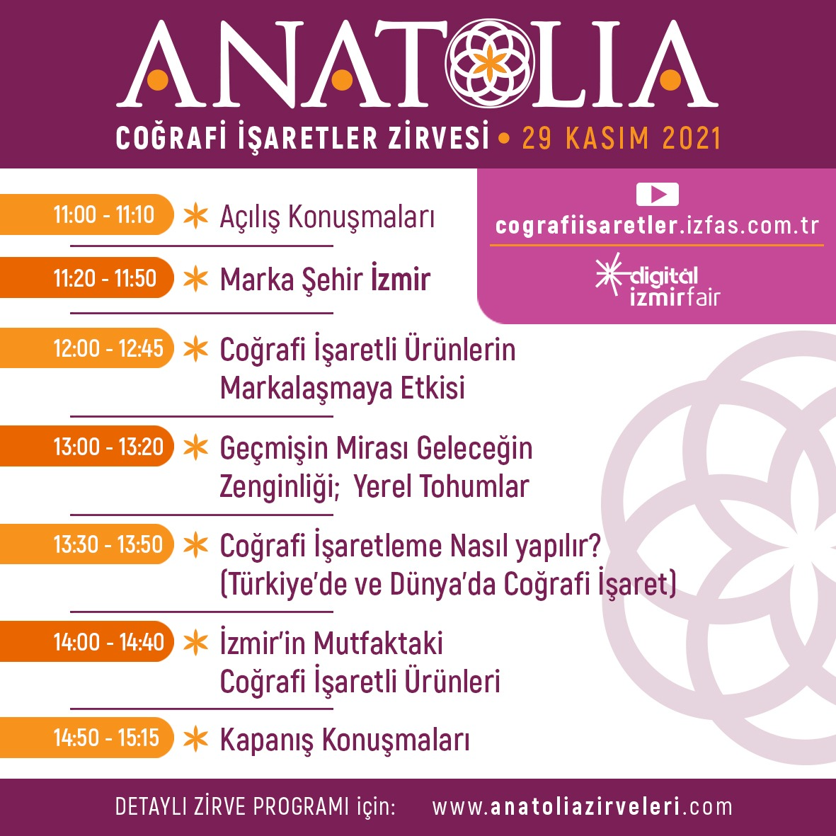 Zirveyi izlemek isteyenler “anatoliazirveleri.com” üzerindeki ön kayıt formunu doldurarak ücretsiz katılım sağlayabilecek. “Marka Şehir İzmir” başlığıyla yapılacak ilk oturumda İzmir Büyükşehir Belediye Başkanı Tunç Soyer, İzmir Ticaret Borsası Başkanı Işınsu Kestelli ve Ege İhracatçı Birlikleri Koordinatör Başkanı Jak Eskinazi konuşma yapacak. Zirvede YÜciTA Yürütme Kurulu Başkanı Prof. Dr. Yavuz Tekelioğlu, Gaziantep Büyükşehir Belediye Başkanı Fatma Şahin, TARKEM Genel Müdürü Sergenç İneler, Ulusal Zeytin ve Zeytinyağı Konseyi Yönetim Kurulu Başkanı Mustafa Tan, İzmir Büyükşehir Belediyesi Tarımsal Hizmetler Dairesi Başkanı Şevket Meriç, Yaşar Üniversitesi Gastronomi ve Mutfak Sanatları Bölüm Başkanı Doç. Dr. Seda Genç, DEÜ SBE Gastronomi ve Mutfak Sanatları Anabilim Dalı Başkanı Doç. Dr. Turgay Bucak, arkeolog ve gıda mühendisi Ahmet Uhri, gazeteci-yazar Nedim Atilla, ziraat mühendisi ve İzmir Ticaret Borsası Genel Sekreter Yardımcısı Dr. Pınar Nacak, Değirmenci Patent & Marka Kurucusu avukat Huriye Değirmenci Yadel, gurme ve şef Ahmet Güzelyağdöken de konuşacak.