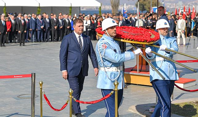 İzmir Büyükşehir Belediye Başkanı Dr. Cemil Tugay, 29 Ekim Cumhuriyet Bayramı kapsamında Cumhuriyet Meydanı’nda düzenlenen Atatürk Anıtı’na çelenk sunma programına katıldı. Törende İzmir Valisi Dr. Süleyman Elban, Ege Ordusu ve Garnizon Komutanı Orgeneral İrfan Özsert’in yanı sıra İzmir milletvekilleri, ordu ve emniyet mensupları, oda, dernek ve sivil toplum kuruluşlarının temsilcileri yer aldı. Marşlar eşliğinde düzenlenen törende gençler dev Türk bayrağı açtı.