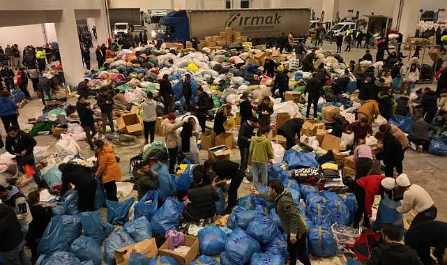 Deprem bölgesine ulaştırılmak üzere 11 tır, iki uçak ve bir gemiyle toplamda 42 bin 830 battaniye, 2 bin 532 elektrikli ısıtıcı, 250 kömür sobası, 2 bin paket bebek bezi, 2 bin 480 yorgan, 3 bin yastık, 128 paket bebek maması, 3 bin 960 paket hijyenik ped, 64 bin 61 giyim malzemesi, 810 çift çizme, 400 yağmurluk, 3 bin 11 uyku tulumu, 2 bin 360 uyku matı, 6 bin 843 paket hijyen paketi, bin 286 gıda kolisi, 51 bin 956 su, 200 çadır, 500 çadır zemin malzemesi, 290 kamp sandalyesi, 24 koli anne bebek kolisi, 10 bebek yatağı, 9 bin 650 cerrahi maske, 10 koli ilk yardım malzemesi, 10 ton yakacak, 500 hasta bezi, 200 powerbank, 144 adet 5 litre su, bin 200 adet 1,5 litre su, 514 yatak süngeri gönderildi.