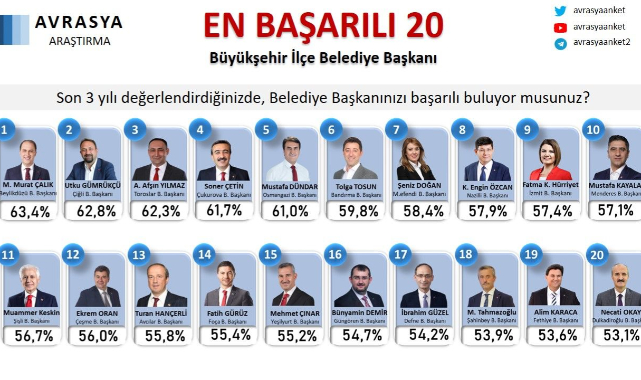 Türkiye genelinde 20 büyükşehir ve ilçelerinde online gerçekleştirilen ve 225 bin kişi katıldığı ankette İzmir’den iki ilçe belediye başkanı ilk 10’a girdi.