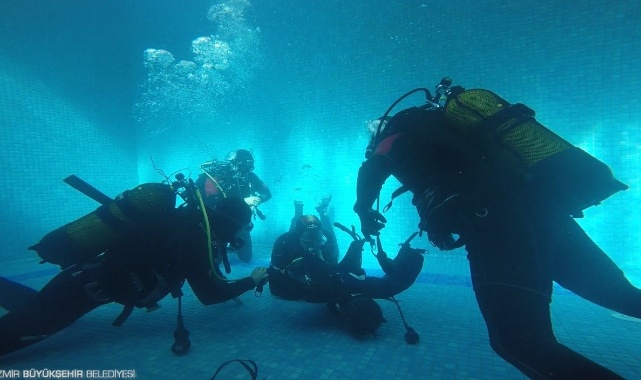 Sualtı arama kurtarma dalgıç ekipleri Büyükşehir’in Buca Sosyal Yaşam Kampüsü içerisinde yer alan havuzda haftanın üç günü sabahın erken saatlerinde eğitime başlıyor. Yürüme parkuru, şınav, mekik, barfiks ve yüzme becerilerinin ardından farklı felaket senaryolarına göre sualtındaki olaylara müdahale çalışması yapıyor.