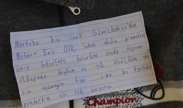 Kahramanmaraş Pazarcık ve Elbistan merkezli, 10 ili etkileyen 7.7 ve 7.6 büyüklüğündeki depremlerin ardından İzmirliler de afet bölgesindeki vatandaşlara yardım etmek için harekete geçti. 10 Yaşındaki İzmirli çocuk Mehmet Emir Işık'ın eşyaların arasına bıraktığı, "Merhaba ben İzmir Güzelbahçe'den Mehmet Emir Işık. Sabah okula gitmeden önce haberlere bakarken orada deprem olduğunu duydum. Çok üzüldüm. Siz üşümeyin diye bu kıyafetleri gönderdim. Sizleri çok seviyoruz" notu ise duygulandırdı.