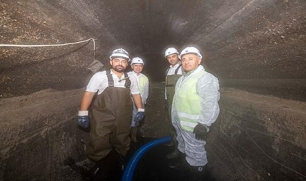 90’lı yıllarda Büyük Kanal Projesi’nin bir parçası olarak Basmane Meydanı’ndan başlayarak Mürselpaşa Bulvarı üzerinden Yenişehir’e uzanan 2200 milimetre çapındaki ana kolektör hattında temizlik çalışmaları sürüyor. İzmir’in kanalizasyon sisteminin ana yükünü taşıyan 45 kilometre uzunluğundaki hat içerisinde birleşik sistemden kaynaklı olarak biriken teressübatın kokuya neden olmaması için İZSU ekipleri tarafından titiz bir çalışma yürütülüyor. Eylül ayı sonunda çalışmalara başlayan ekipler, şu ana kadar hattın 1000 metrelik kısmını temizledi.