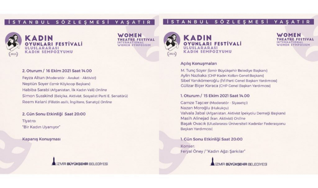 Türkiye'de kadın teması ile geçen Mart ayında dört şehirde yapılan Kadın Oyunları Festivali'nin final etkinliği olarak düzenlenen sempozyumun 15 Ekim saat 14.00’teki birinci oturumu, CHP Ankara Milletvekili Gamze Taşcıer moderatörlüğünde yapılacak. İlk oturuma hukukçu Nazan Moroğlu, Afgan kadın aktivisit Valvala Jalal, Uluslararası Üniversiteli Kadınlar Federasyonu Başkan Yardımcısı Başak Ovacık ve çevrim içi olarak İranlı kadın aktivist Masih Alinejad katılacak. 20.00’de Feryal Öney’in “Kadın Ağzı Şarkılar” konseri var. İkinci oturum ise 16 Ekim 14.00’te avukat Feyza Altun moderatörlüğünde İzmir Köy Koop Başkanı Neptün Soyer, Belçikalı kadın aktivist ve Sosyalist Parti Eski Senatörü Simon Susskind, çevrim içi olarak Afganistan’ın ilk kadın valisi Habiba Sarabi ile Filistin asıllı sanatçı Reem Kelani’nin katılımıyla yapılacak. 20.00’de ise “Bir Kadın Uyanıyor” adlı tiyatro oyunu sanatseverlerle buluşacak.